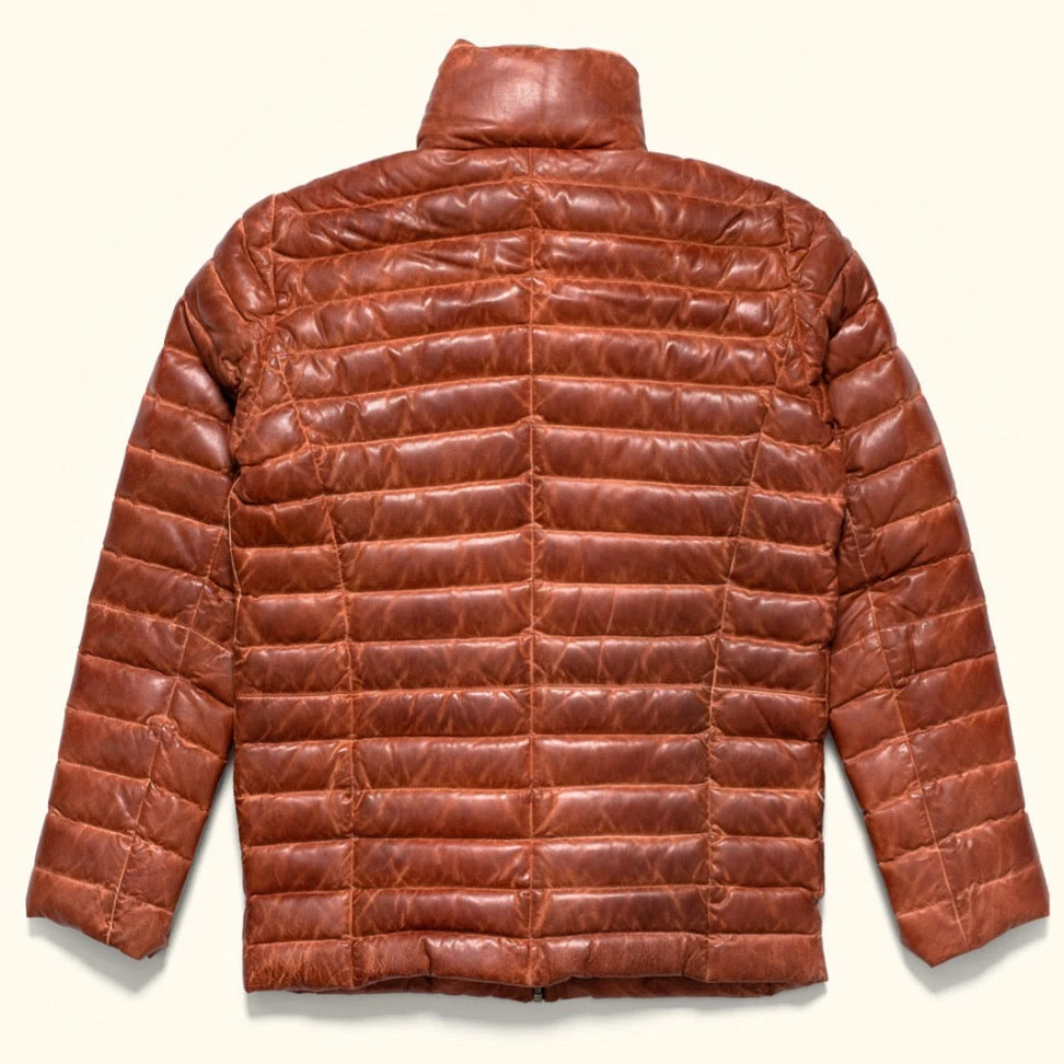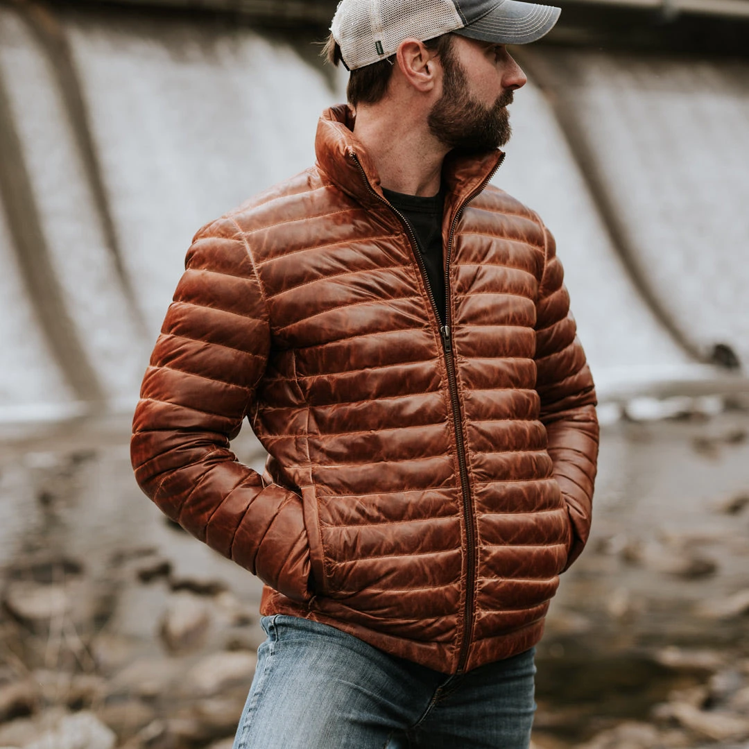 Lambskin is an exceptionally wearable and soft leather. Its natural, lightweight layers give it a distinctive, velvety texture. Even though lambskin leather is thin and lightweight, it still does a good job of keeping out the cold, making it an ideal material for a leather down jacket. Because of its delicate structure, lambskin is treated less harshly in production than cowhide and requires more hand manipulation. This often results in lambskin being more expensive than cowhide, which is why it’s generally reserved for premium leather products like our Bridger leather down jacket.