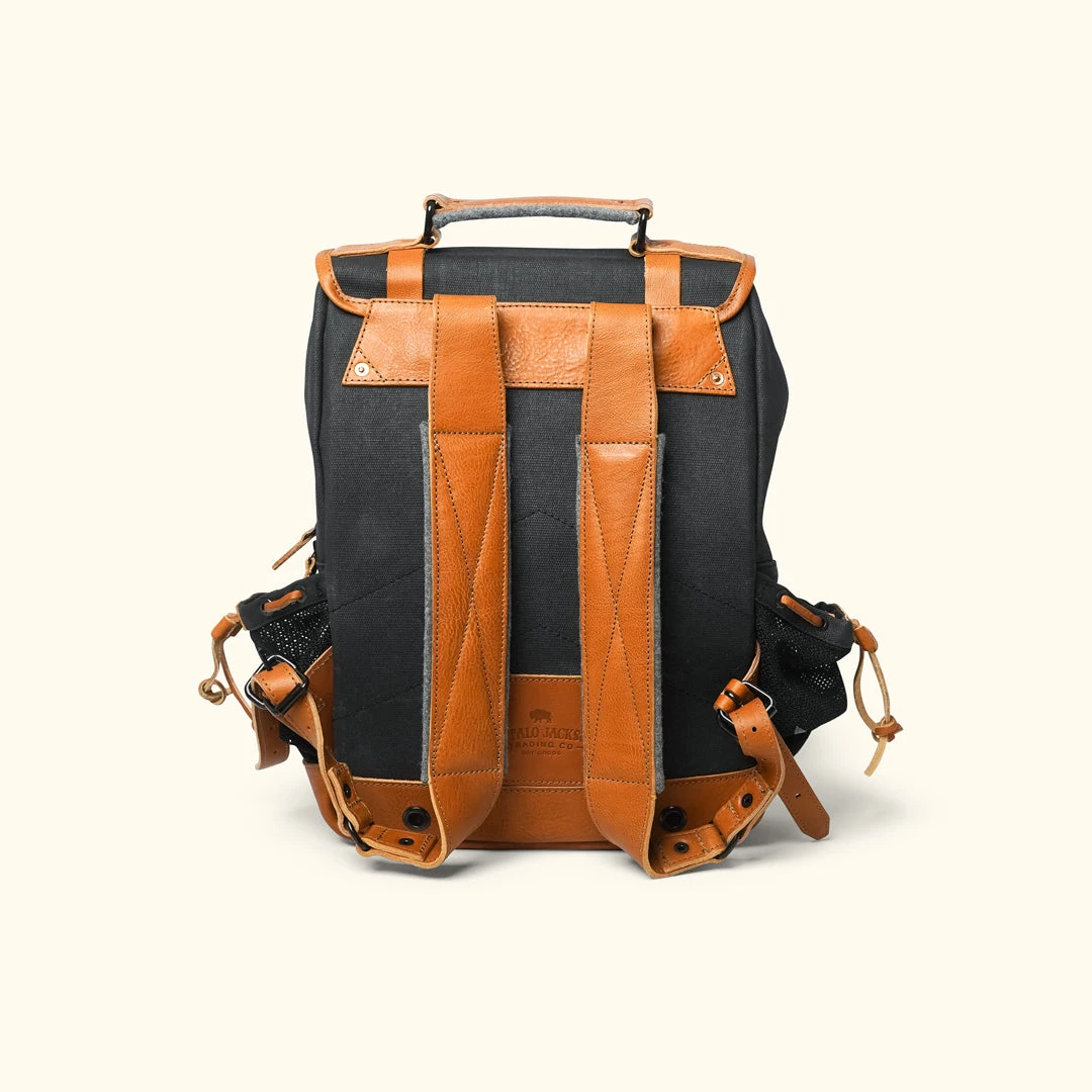 This canvas backpack features adjustable water bottle pockets, an exterior quick access opening, adjustable leather shoulder straps, and a padded interior laptop screen (fits most 15” screen display laptops). Inside, store key essentials such as pens, a phone, and other accessories in the two interior pockets.