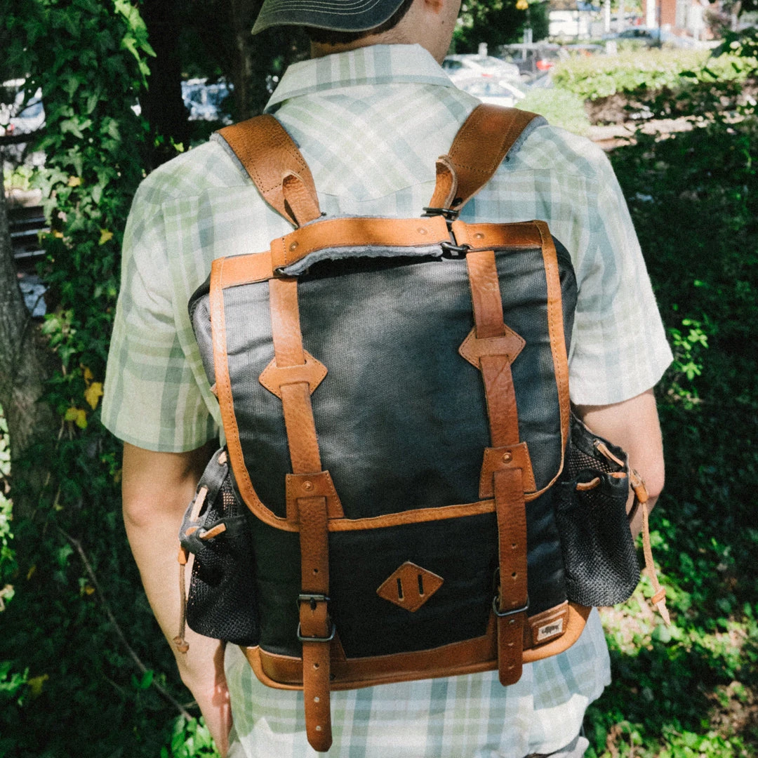 Our Dakota Commuter Vintage Backpack comes in khaki, tan, or navy. It’s crafted of a beautiful combination of waxed coated canvas and top grain leather. While it’s not completely waterproof, it’s designed to withstand raindrops and water if the canvas is properly conditioned over time. At 12.5” long, 4.5” wide, and 17” high, it’s a great size to hold necessities for hikes, work, or day adventures.
