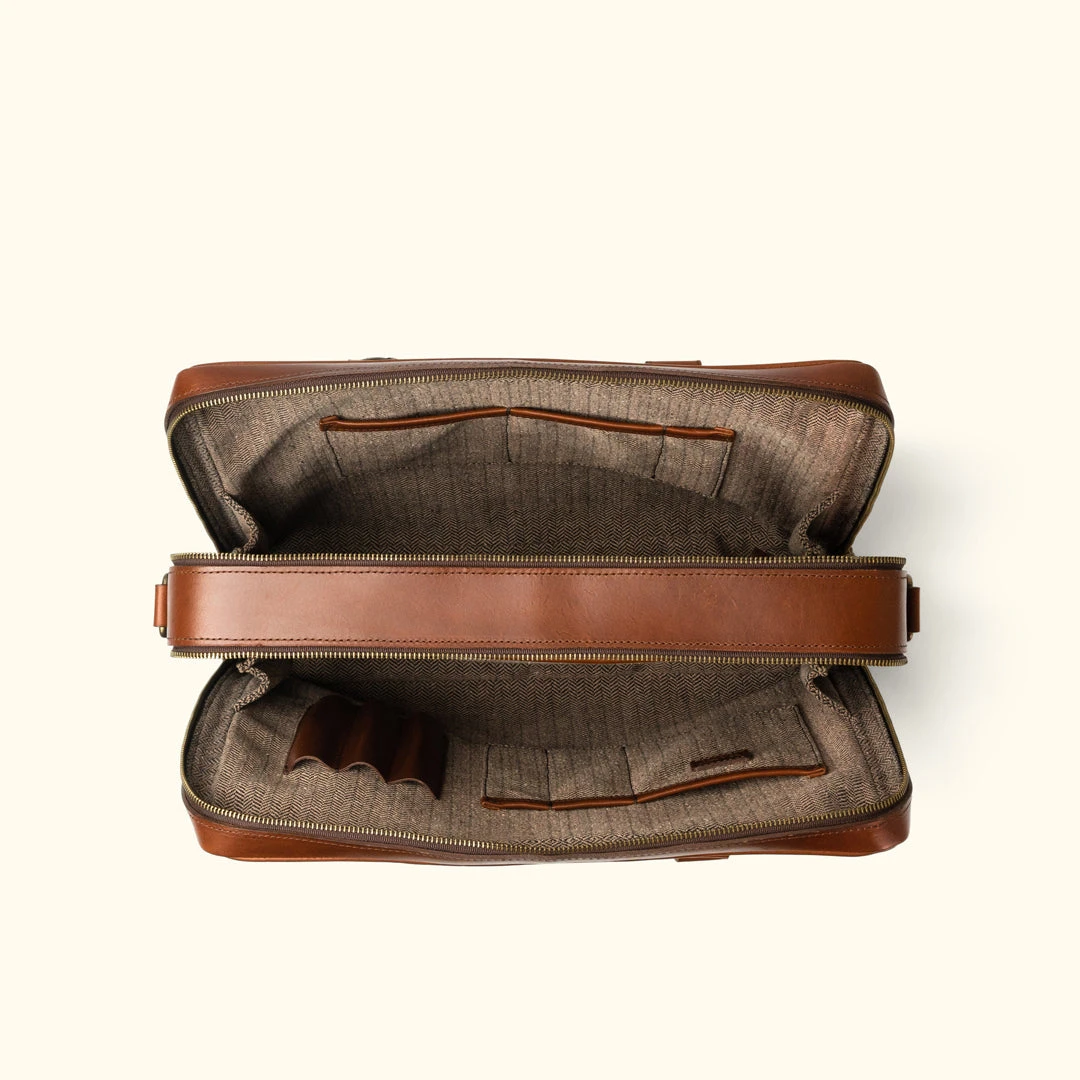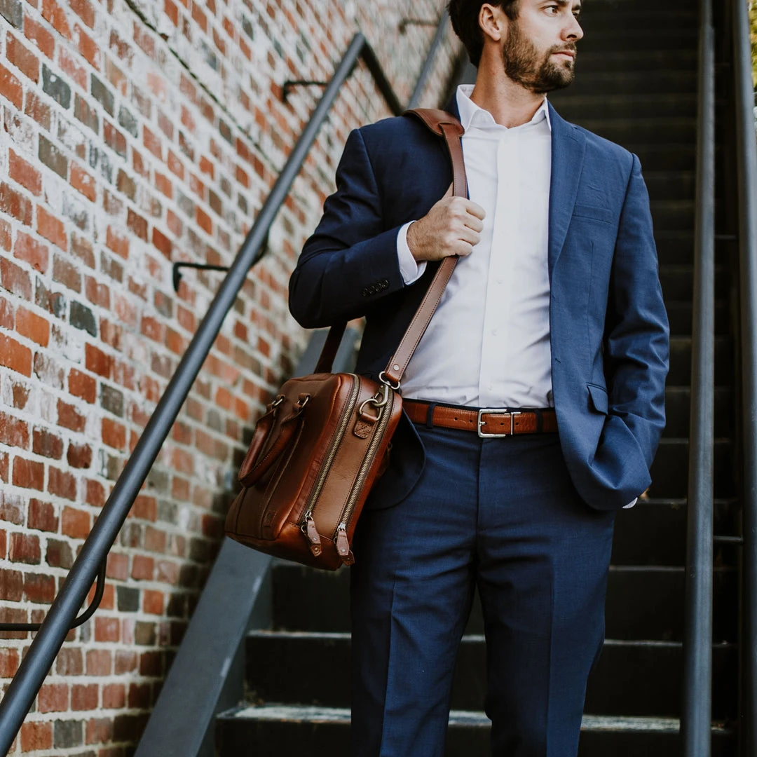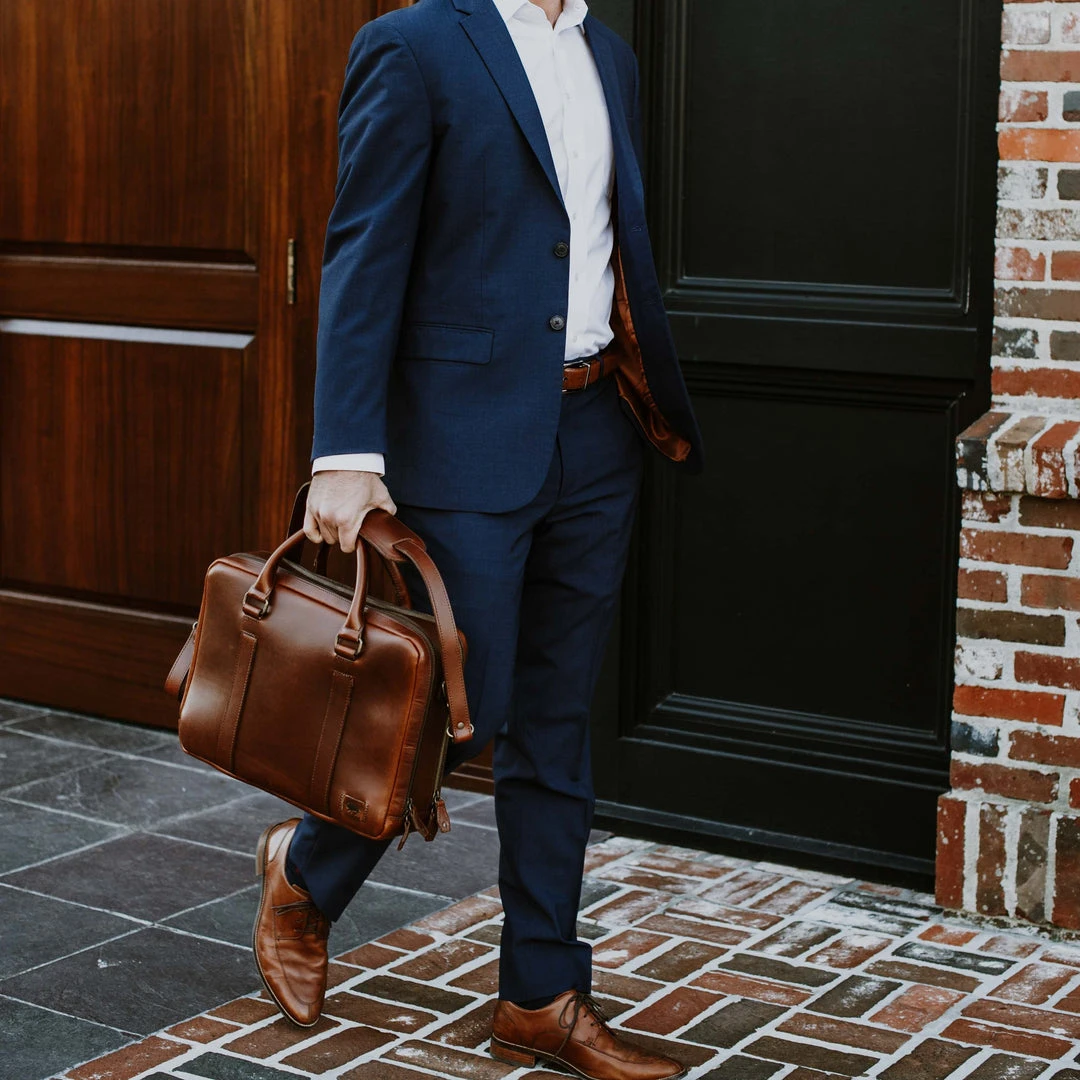 The Jefferson Leather Briefcase. One look and you’ll see the craftsmanship we’ve poured into this premium bag. From the outside, you’ll notice the luxurious tanned leather, while unzipping the bag (our first collection w/out buckles) reveals a classic herringbone lining and a strenuously designed inside organizational layout.