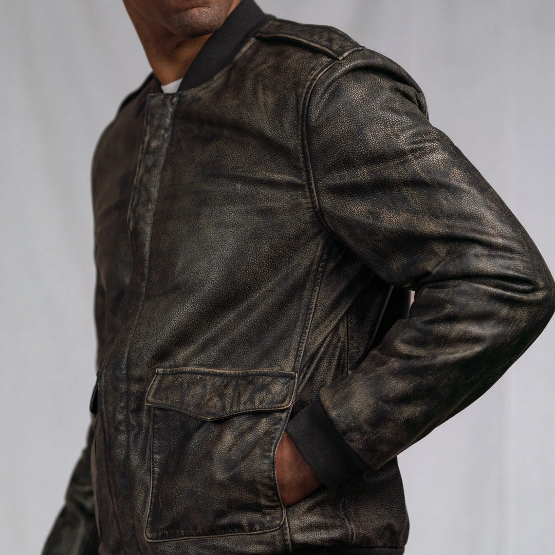 A leather jacket as rugged and iconic as the battle-tested captains of the sky. Where classic aviator style meets first-class quality and design. Crafted with 100% full grain cow leather, our leather bomber jacket features a concealed full-length zipper and snug cotton detailing at the neck, wrists, and waist to provide warmth and comfort for brisk nights on the town or chasing the horizon.